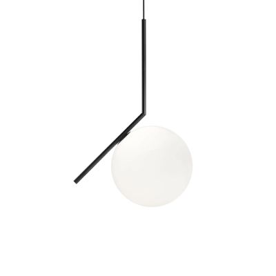 IC di Flos è un apparecchio di illuminazione da sospensione a luce diffusa. Telaio in ottone, nero o acciaio cromato. Diffusore opalino di vetro soffiato.